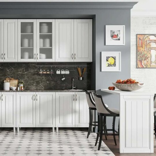 Шкаф навесной 550/912 со стеклостворкой авиньон. Кухонный гарнитур Прованс - это сочетание простого домашнего уюта и утонченного французского шарма. Лёгкий и романтичный, этот стиль, воссозданный в интерьере кухни, способен преобразить любое, даже самое скромное помещение. В стеклостворках гарнитура используется матированное стекло с красивым геометрическим рисунком. Фасады комплектуются металлическими ручками «Бронза» с керамическими вставками, некоторые модули комплектуются ручками-кнопками. Гарнитур можно доукомплектовать карнизом, цоколем, доводчиками на выкатные ящики и демпферами на петли створок.