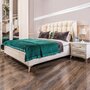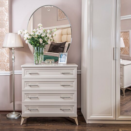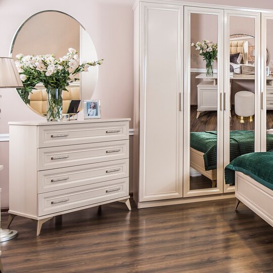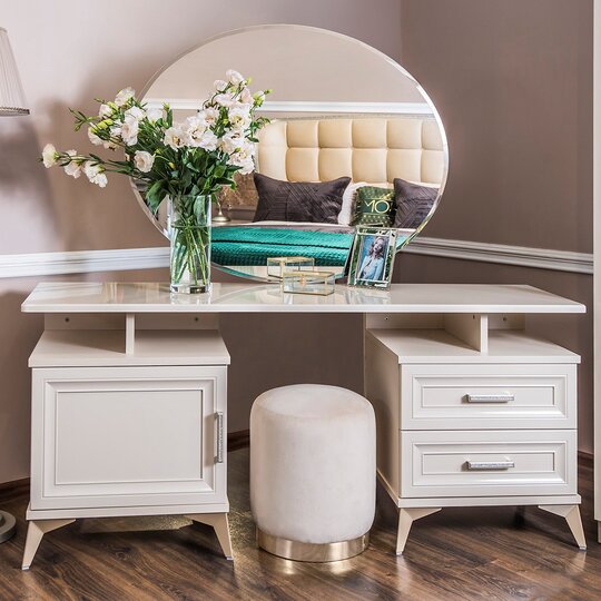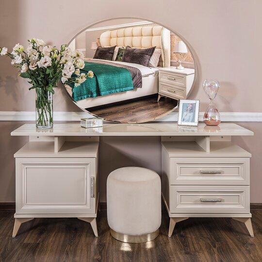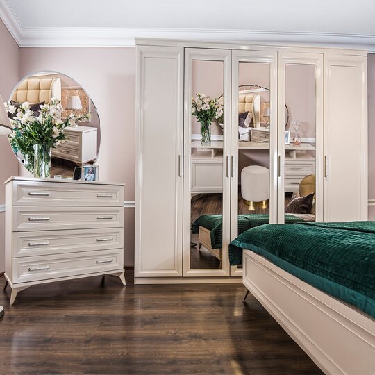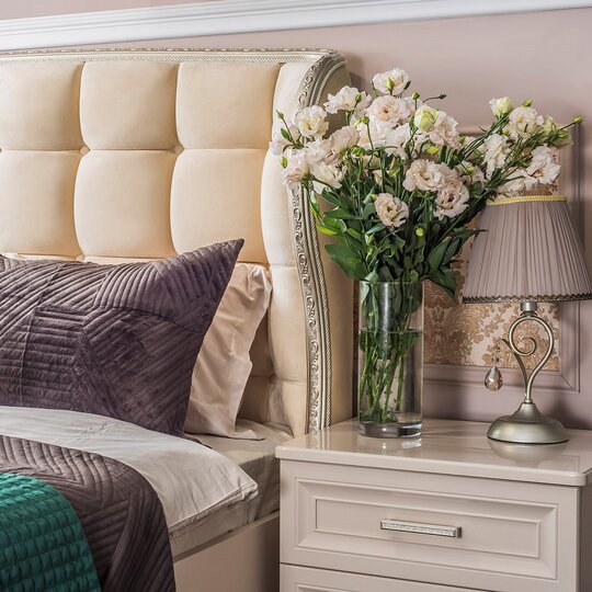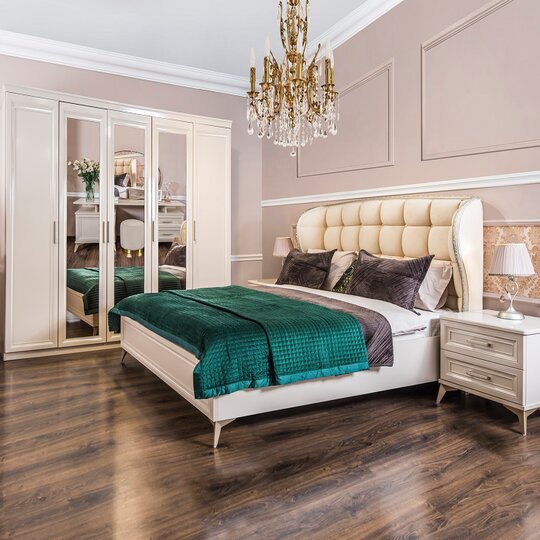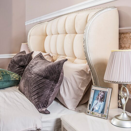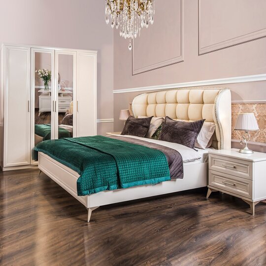 Утонченные элементы, роскошная обивка, витиеватые накладки доставят эстетическое наслаждение своим владельцам. Бежевый цвет «мокко» мебели позволяет визуально увеличить пространство спальни, подчеркнуть важные детали, добавив в пространство легкости и света.