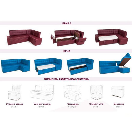 Угловой диван Бриз один из наилучших вариантов для небольшой кухни. Модель оснащена спальным местом и просторной нишей для хранения под сидением оттоманки. Стандартные размеры 204х114см (на заказ можно изготовить удлиненную оттоманку, размер дивана подрастет до 204х139см). Модульные малогабаритные диваны серии Бриз отлично дополнят интерьер современной кухни или прихожей. В зависимости от набора и сочетания модулей диван может быть разного размера, оснащен большим количеством функциональных ниш для хранения и спальным местом.