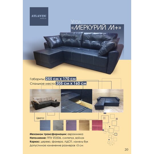 Ширина мм:2550 Высота мм:750 Глубина мм:1700 Спальное место:1600*2100 Механизм раскладывания дивана:Еврокнижка Ткань :1 категория ткани Материал корпуса:Дерево Гарантия:12 месяцев Бренд:​Atlantic-мебель