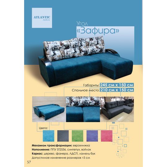 Ширина мм:2450 Высота мм:750 Глубина мм:1500 Спальное место:1500*2100 Механизм раскладывания дивана:Еврокнижка Ткань :1 категория ткани Материал корпуса:Дерево Гарантия:12 месяцев Бренд:​Atlantic-мебель
