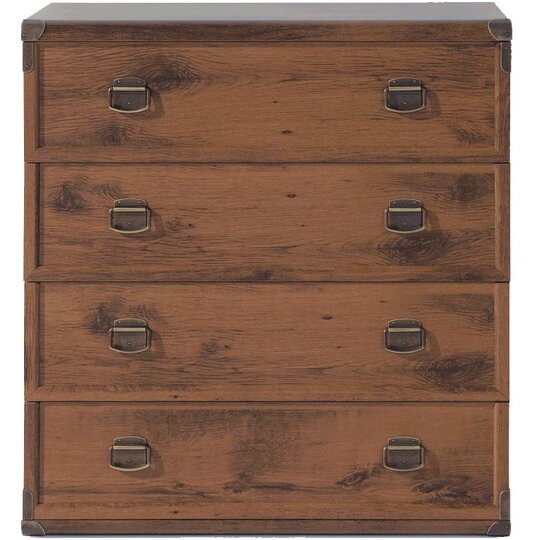 Особенности комода. Четыре вместительных выдвижных ящика, оснащенных металлическими роликовыми направляющими и оригинальной фурнитурой. Уголки конструкции украшены металлическими накладками. Поверхность имитирует фактуру древесины.