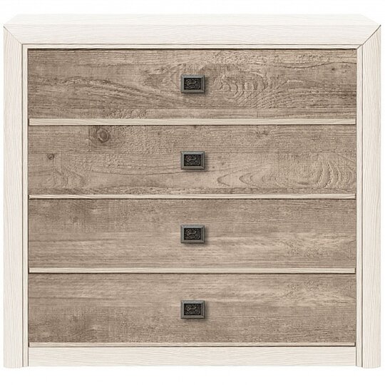 Особенности комода. Четыре вместительных выдвижных ящика. Каркас выполнен из ДСП. Стильная фактура и оригинальная фурнитура из металла дополняют изделие, украшая его.