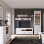 Особенности тумбы. Две открытых глубоких ниши. Два выдвижных ящика на роликовых направляющих. Две ниши со вставными полками внутри, закрывающиеся распашными дверями. Конструкция дополнена стильной фурнитурой.