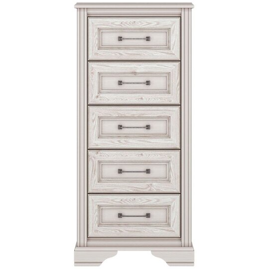 Особенности комода. Пять вместительных выдвижных ящиков, оснащенных металлическими роликовыми направляющими и оригинальной фурнитурой. Поверхность имитирует фактуру древесины.