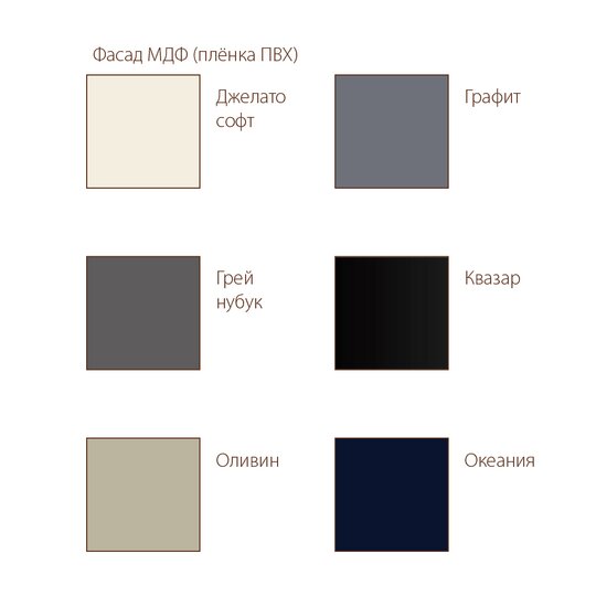 • Антрацит, Бланж, Графит, Грей, Дуб Торонто, Джелато софт, Квазар, Мерино, Нео, Океания, Оливин и Олива софт.