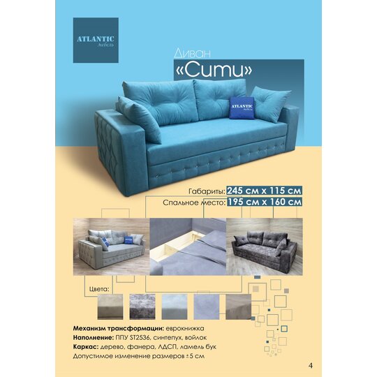 Ширина мм:2450 Высота мм:870 Глубина мм:1150 Спальное место:1600*1950 Механизм раскладывания дивана:Еврокнижка Ткань :1 категория ткани Материал корпуса:Дерево Гарантия:12 месяцев Бренд:​Atlantic-мебель