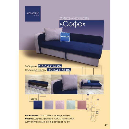 Ширина мм:2150 Высота мм:750 Глубина мм:750 Спальное место:720*1900 Ткань :1 категория ткани Материал корпуса:Дерево Гарантия:12 месяцев Бренд:​Atlantic-мебель