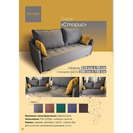 Ширина мм:2100 Высота мм:750 Глубина мм:900 Спальное место:1500*2000 Механизм раскладывания дивана:Еврокнижка Ткань :1 категория ткани Материал корпуса:Дерево Гарантия:12 месяцев Бренд:​Atlantic-мебель