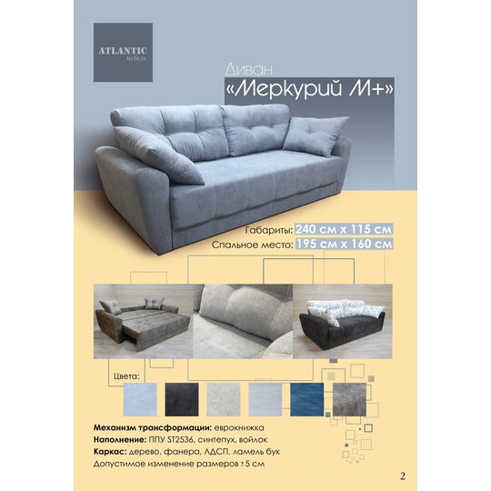 Ширина мм:2400 Высота мм:770 Глубина мм:1150 Спальное место:1600*1960 Механизм раскладывания дивана:Еврокнижка Ткань :1 категория ткани Материал корпуса:Дерево Гарантия:12 месяцев Бренд:​Atlantic-мебель
