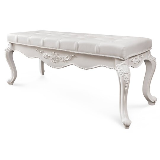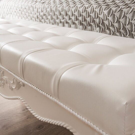 Великолепная двухместная банкетка с мягким сиденьем,  нежная, словно фарфоровая, двухместная банкетка с мягким сиденьем из экокожи, декорированным стяжкой и витым кантом. Банкетка выполнена с фигурной царгой на четырех гнутых опорах кабриоль с дивной цветочной лепниной.