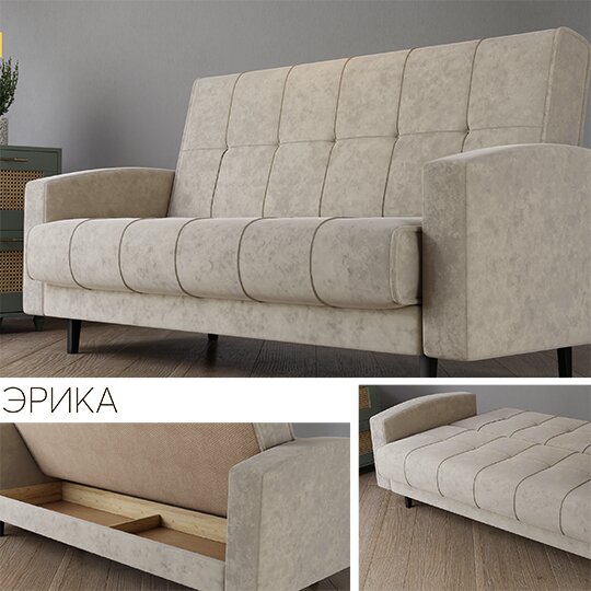 Диван Эрика для ежедневного пользования.Диван с пружинным блоком и механизмом складывания еврокнижка  — это удобное и практичное приобретение. В собранном состоянии на нем может сидеть три человека, а в разложенном это комфортное спальное место.  Производитель дивана гарантирует его надежность и долгий срок эксплуатации. Механизм раскладывания книжка, простая и надежная конструкция. Каркас выполнен из фанеры и бруса.