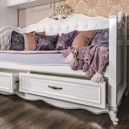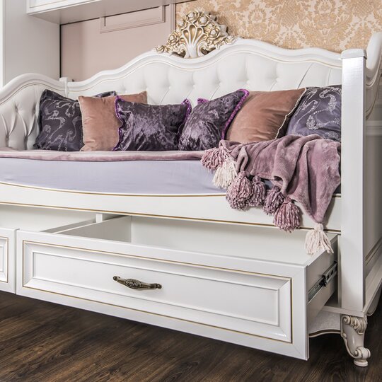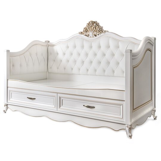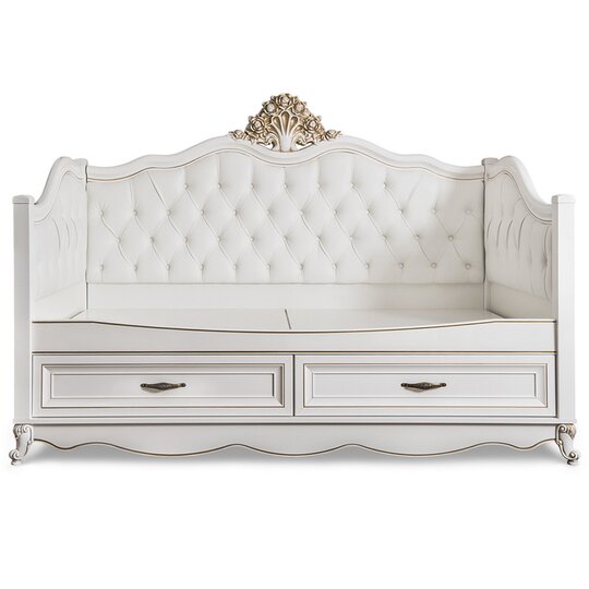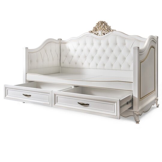 Нежный диван белого цвета станет отличным ложем для вашей маленькой принцессы. Каретная стяжка на спинке и стенках придает дивану более возвышенный вид. Размер спального места-90*200 см.