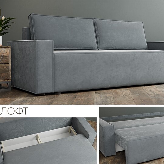 Диван Лофт для ежедневного пользования.Диван с пружинным блоком и механизмом складывания еврокнижка  — это удобное и практичное приобретение. В собранном состоянии на нем может сидеть три человека, а в разложенном это комфортное спальное место.  Производитель дивана гарантирует его надежность и долгий срок эксплуатации. Механизм раскладывания книжка, простая и надежная конструкция. Каркас выполнен из фанеры и бруса.