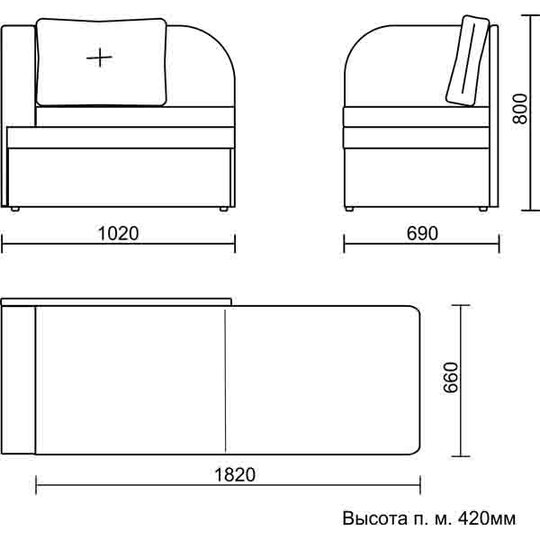 Небольшой по габаритам диванчик. Ровное односпальное место. Спальное место сформировано на основе деревянной рамки с латами, на которую уложен эластичный пенополиуретан. Присутствует выдвижной короб для хранения постельных принадлежностей. Комплектуется декоративной подушкой. угол дивана не меняется, просьба указывать при заказе. Мягкие съемные спинки дивана. При трансформации диван находится вплотную к стене.  Механизм раскладки "Софа", раскладка в сторону вдоль стены.
