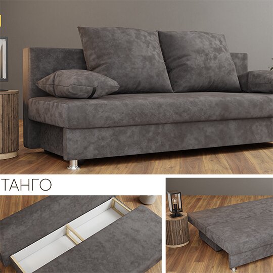 Диван Танго для ежедневного пользования.Диван с пружинным блоком и механизмом складывания еврокнижка  — это удобное и практичное приобретение. В собранном состоянии на нем может сидеть три человека, а в разложенном это комфортное спальное место.  Производитель дивана гарантирует его надежность и долгий срок эксплуатации. Механизм раскладывания книжка, простая и надежная конструкция. Каркас выполнен из фанеры и бруса.