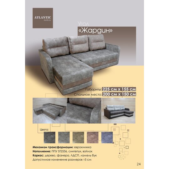 Ширина мм:2250 Высота мм:750 Глубина мм:1550 Спальное место:1500*2000 Механизм раскладывания дивана:Еврокнижка Ткань :1 категория ткани Материал корпуса:Дерево Гарантия:12 месяцев Бренд:​Atlantic-мебель