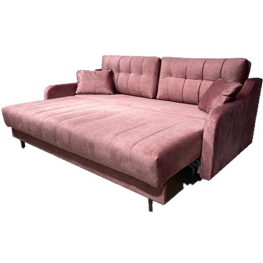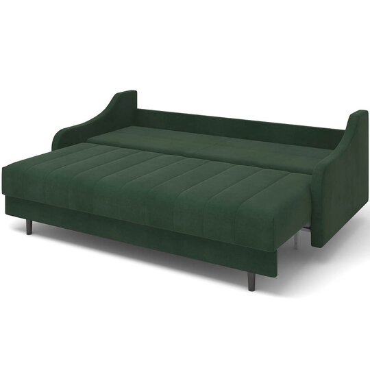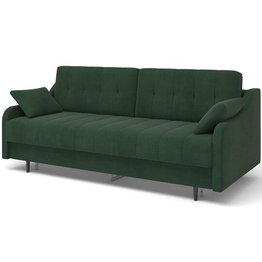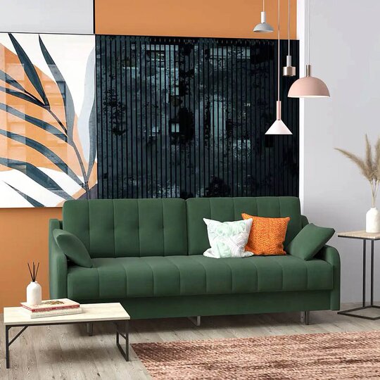 Диван Женева выполнен в модном стиле mid century. Отличительной особенностью модели являются фигурные подлокотники, которые в сочетании с минимализмом прямых форм сиденья и спинки, создают целостный современный образ. Высокие опоры придают дивану легкости и облегчают процесс уборки: клиренс 10 см позволяет свободно маневрировать роботу-пылесосу. Дополнительное преимущество - задняя спинка в основной ткани, что дает возможность размещать диван не только у стены, но и в любом месте помещения. Особую прочность дивану придает металлический каркас из конструкционной стали, а простой и надежный механизм трансформации - пантограф - обеспечивает долгий срок службы.