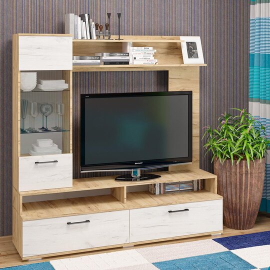 Это практичное решение для современной жилой зоны, позволяет эргономично обустроить пространство. Нестандартным стилевым решением выступают разноуровневые полки на фоне с прямоугольными, контрастными выдвижными ящиками, а естественная фактура натурального дерева, органично дополнена фасадом с элементами стекла, что визуально облегчает массивность конструкции.