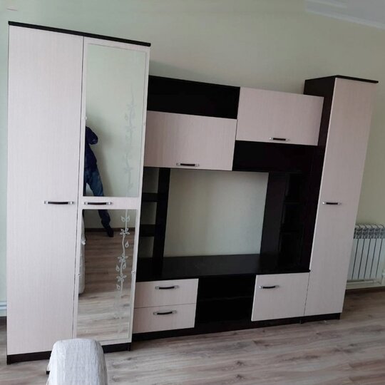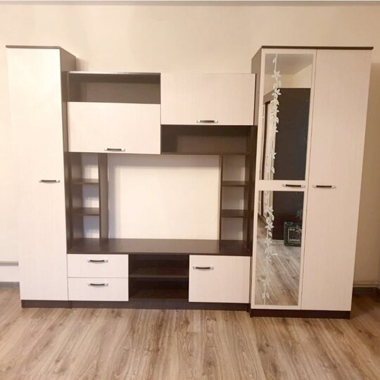 В центре предусмотрена большая ТВ-ниша, а в глубоком шкафу удобно расположится верхняя одежда, особенно крупная: зимние куртки и пальто. Широкие плоские ручки безопасны, при этом удобны для взрослых и детей. На одной из дверей платяного шкафа есть большое зеркало с цветочным рисунком.