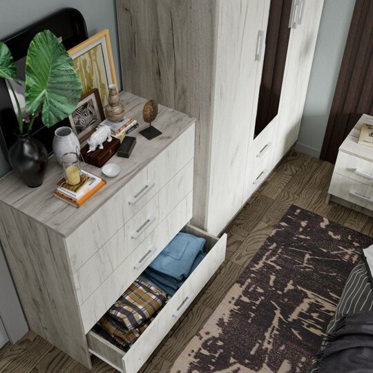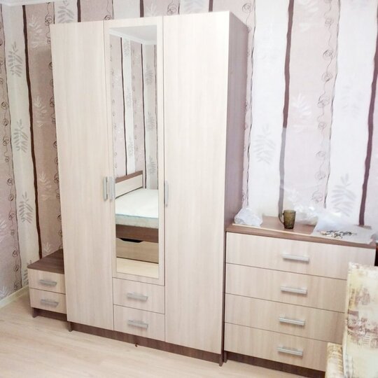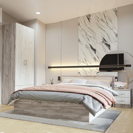 Стильный и яркий комплект для спальни Гармония впечатляет оригинальным дизайном и простотой форм. Такая мебель станет незаменимым дополнением современного интерьера, в котором красота и функциональность имеют значение. Теперь в вашей комнате все настраивает на полноценный отдых.  Вся мебель производится из качественного ЛДСП, отличающегося высокой прочностью. Для удобства использования все дверцы и ящички дополнены стильными и лаконичными ручками, добавляющими общей картине изящности. Столешницы тумбочках можно использовать с толком, разместив на них фотографии, ночник, вазу, любимые книжки и многое другое. Комплект для спальни Гармония является воплощением хорошего вкуса и современности. Он выполнен в современном стиле и полностью соответствует основным канонам этого направления.
