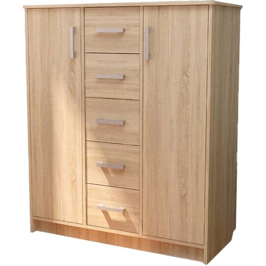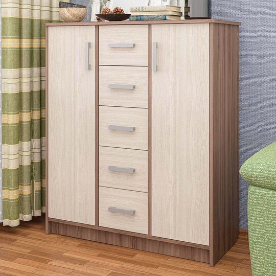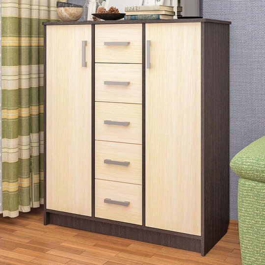 Комод изготовлен из высококачественной и экологичной ламинированной плиты – ЛДСП класса Е1 толщиной 16 мм. Все края изделия обработаны ударопрочной кромкой ПВХ, что значительно увеличивает срок службы изделия. Для сборки используется фурнитура ведущих мировых производителей.