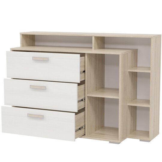 Необычный, стильный и достаточно практичный комод 4-4423 гармонично впишется в любой интерьер комнаты. На открытых полочках отлично разместятся интересные книги, семейные фотографии, оригинальные предметы декора и различные статуэтки. Три вместительных выдвижных ящика и полки, скрытые за распашной дверцей, созданы для хранения одежды и белья, посуды и чайных сервизов, а также для других разнообразных предметов.