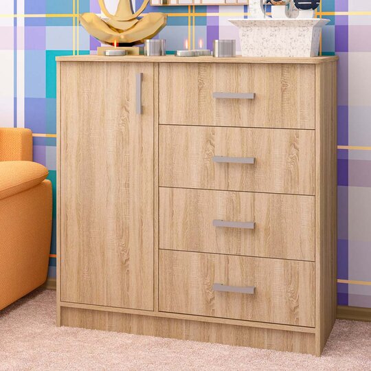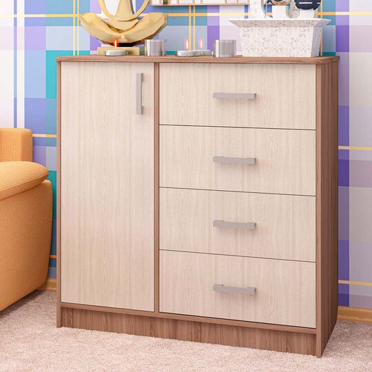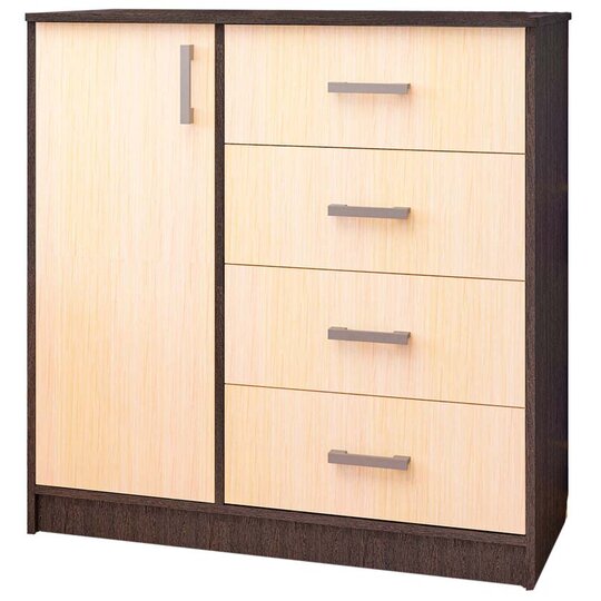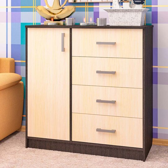 Комод изготовлен из высококачественной и экологичной ламинированной плиты – ЛДСП класса Е1 толщиной 16 мм. Все края изделия обработаны ударопрочной кромкой ПВХ, что значительно увеличивает срок службы изделия. Для сборки используется фурнитура ведущих мировых производителей.
