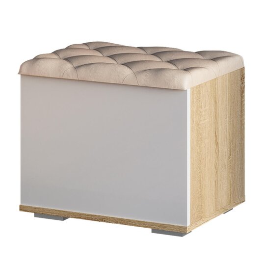 Тумба из модульной коллекции Белладжио станет практичным выбором для вашей прихожей. Изделие выполнено из ЛДСП цвета дуб сонома, фасад белого цвета, крышка тумбы - она же мягкое сиденье, обтянута экокожей светлого оттенка, внутри тумбы можно хранить средства по уходу за обувью или тапочки.