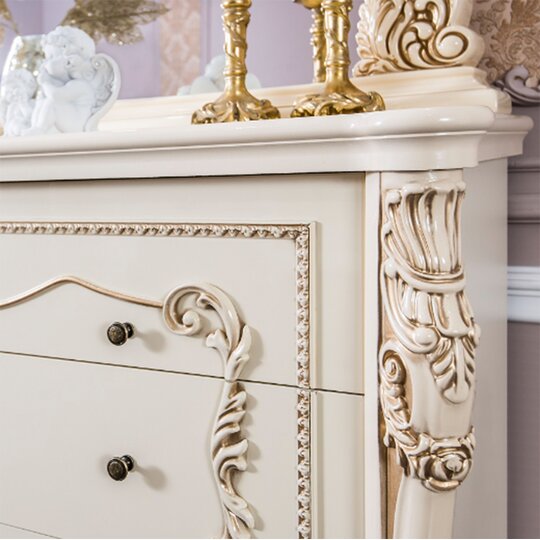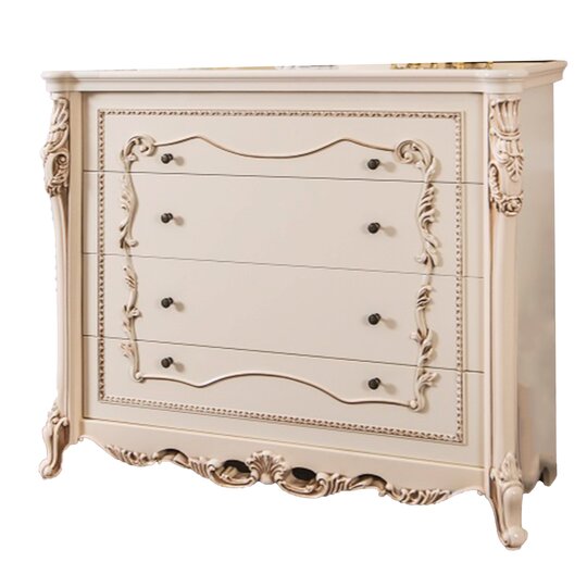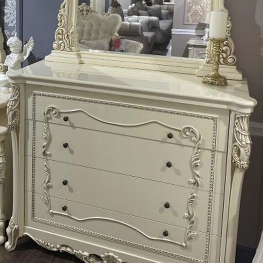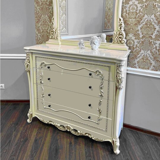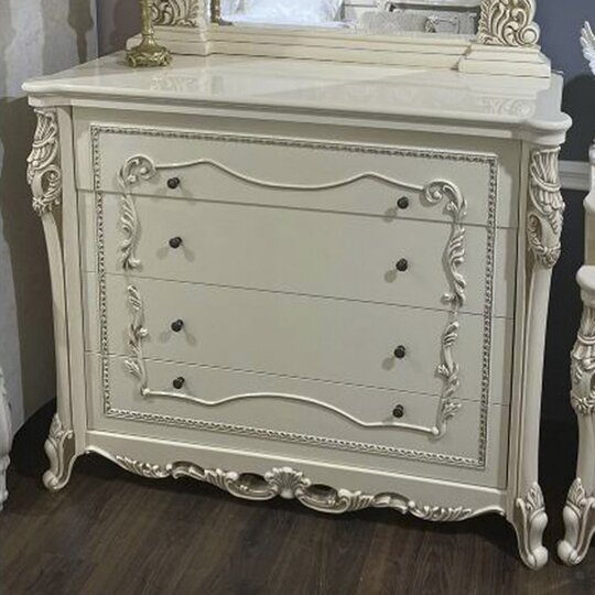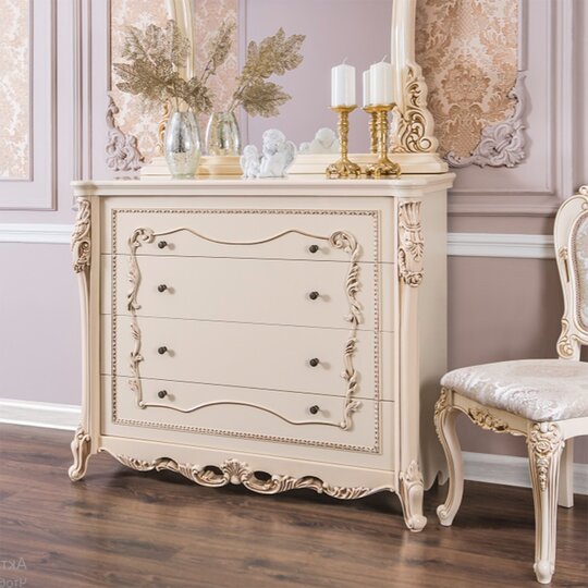 Комод Джоконда-роскошный комод, укомплектованный четырьмя вместительными выдвижными ящиками с резными фасадами, декорированными патинированной фрезеровкой и витиеватой лепниной. Великолепный внешний вид комода позволяет представить спальню изысканной и эстетически привлекательной.