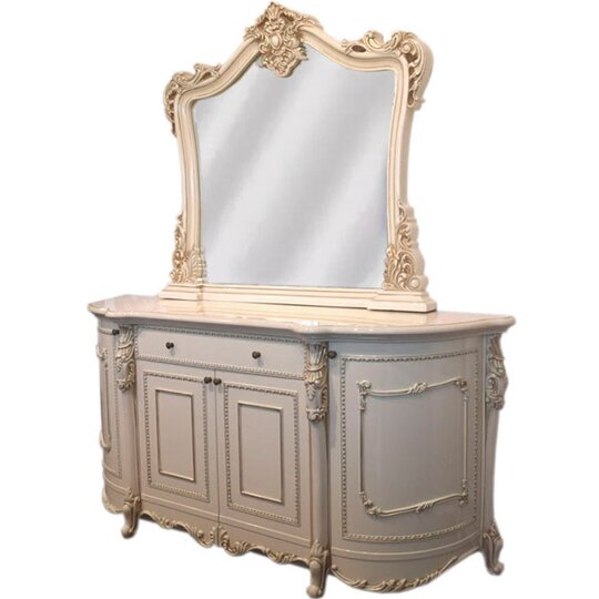 Комод с зеркалом Джоконда - роскошный комфортный элемент классического интерьера гостиной, отсылающий к эпохе старины. Комод с двумя боковыми отделениями за распашными изогнутыми дверцами, с выдвижным ящичком в подстолье и центральным отделением с двумя распашными дверцами, а также фигурной формы зеркало, декорированы балясинами, роскошной лепкой и благородной фрезеровкой с золотой патиной.