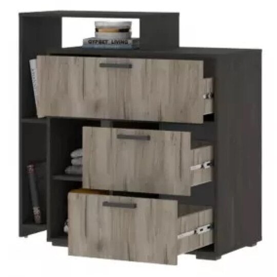 Вместительный комод Эдинбург прекрасно подходит для спальни, детской комнаты или гостиной, благодаря своей конструкции: три выдвижных ящика, открытая ниша с полочками разместят ваши вещи, одежду и аксессуары, а на поверхности вы можете оставить мелочи для быстрого доступа, расставить рамки с фотографиями или украсить предметами интерьера.