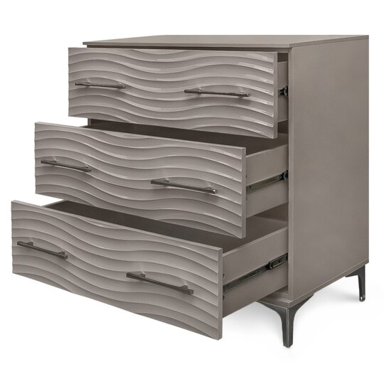 Комод Гравита - красивый модуль для хранения белья и аксессуаров в спальной комнате. Коллекция мебели для спальни Гравита (Gravita) выделяется стильным сочетанием цвета корпусов серый камень с глянцевыми белоснежными рельефными фасадами, обилием зеркал, а также хромированными деталями. Комод оснащен тремя выдвижными ящиками.