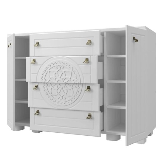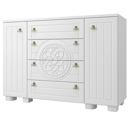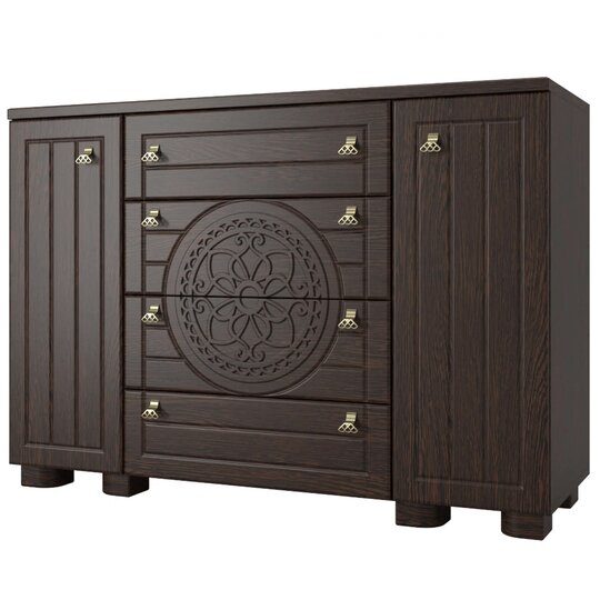 Комод Монблан МБ-36К станет настоящим украшением в вашем доме. Четыре достаточно вместительных выдвижных ящика и полки, скрытые за распашными дверьми, пригодятся для размещения аксессуаров, косметики и мелких предметов. Сверху на комоде вы сможете поставить вазу с красивыми цветами, несколько фотографий и оригинальные статуэтки. Толщина столешницы: МДФ 25 мм. Фурнитура: ящики с телескопическими направляющими полного выдвижения. Высота опоры 50 мм.
