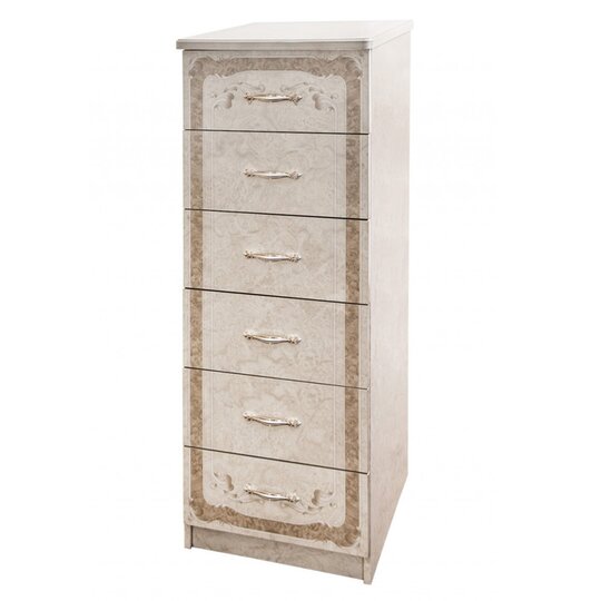Комод 6 ящика Патрисия - высокий грациозный комод укомплектован шестью выдвижными ящиками и представлен в двух цветовых решениях. Столешница и фасады ящиков декорированы изящной шелкографией. Основание комода - цокольное.