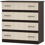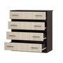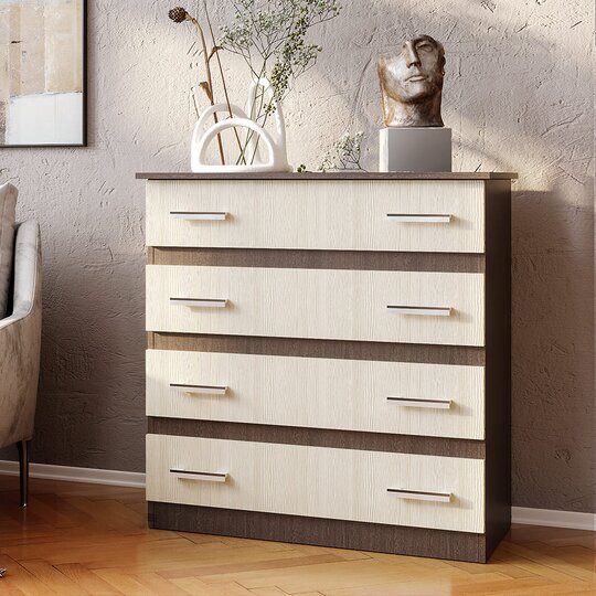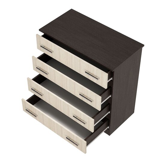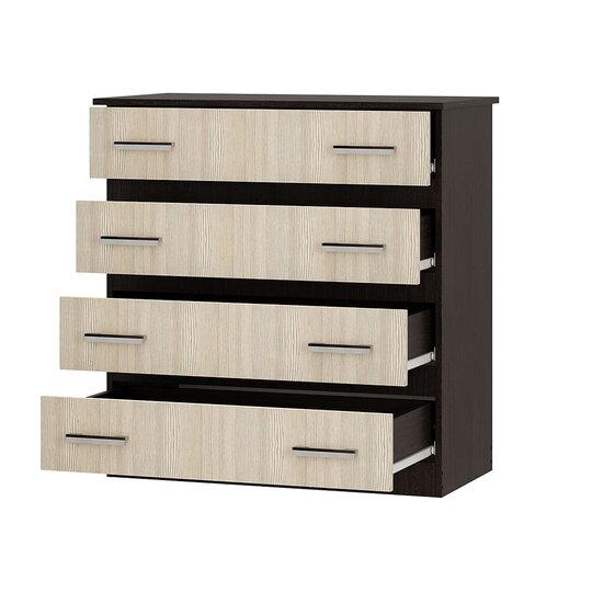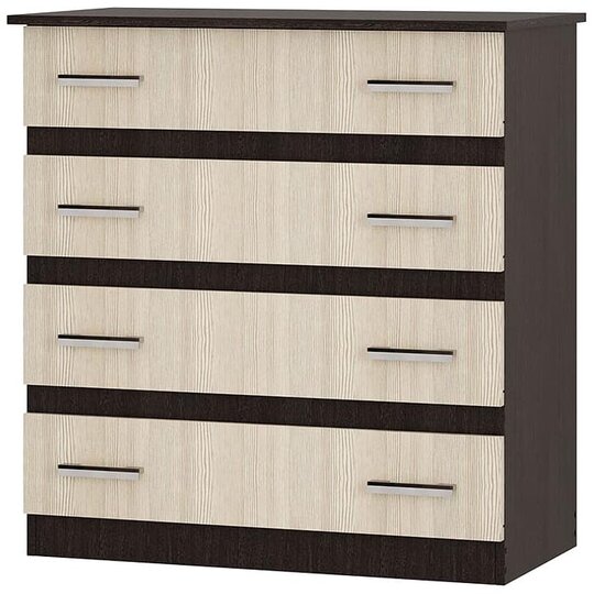 Классическая модель комода Стандарт №6 выполнена из ЛДСП высокого качества. В корпусе используется цвет венге, а фасады выполнены в цвете лоредо, комод состоит из четырех выдвижных ящиков, на каждом из которых расположены две ручки, модель Стандарт №6 выделяется увеличенной столешницей, выходящей за границы корпуса.