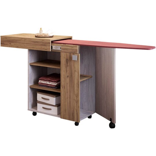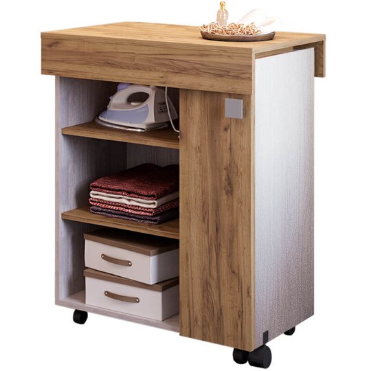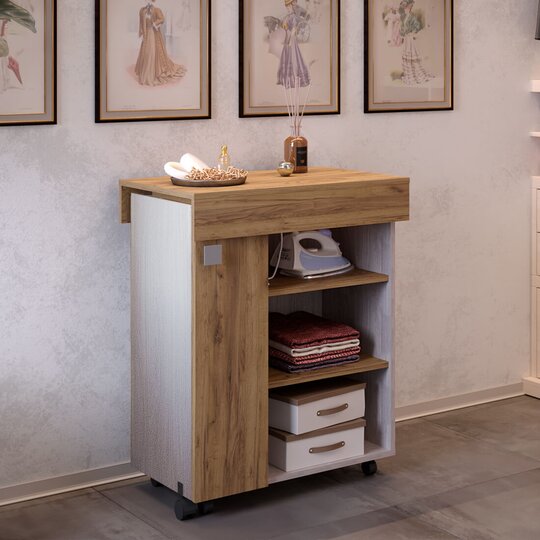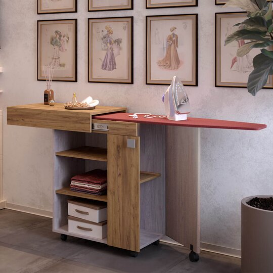 Невероятно практичная вещь – тумба Тео. Все дело в ее многофункциональности, ведь при необходимости модель с легкостью трансформируется в гладильную доску, изделие дополнено полками, на которых можно хранить утюг и необходимые вещи, а также колесиками для большей мобильности, тумба точно выручит владельцев малогабаритных квартир.