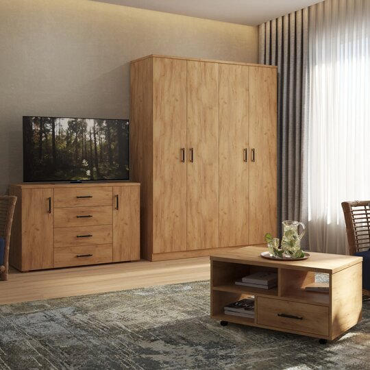 Комод Виктория - выгодное решение для отелей и гостиниц, сбалансированное по цене, качеству и функциональности. В производстве используется ЛДСП, толщины 25/16 мм. Фасады обработаны ударопрочной кромкой ПВХ толщиной 2/0,6 мм. В коллекции используется современная, качественная фурнитура. Базовая комплектация представлена в декоре Дуб крафт золотой и Северное дерево светлое.
