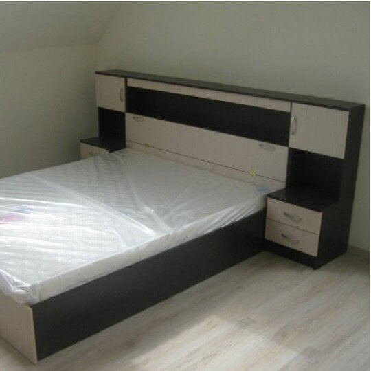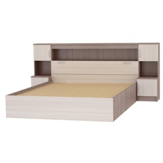 Большая двуспальная кровать с прикроватными блоками, выполненная в классическом стиле, позволит создать уютную обстановку для сна и отдыха в спальне. Конструкция изделия представляет собой сочетание кровати и вместительного блока, с множеством открытых полочек и закрытых секций с распашными дверцами для книг, декора, одежды, постельных принадлежностей и прочих вещей. Дополнительно необходимо приобрести матрас.