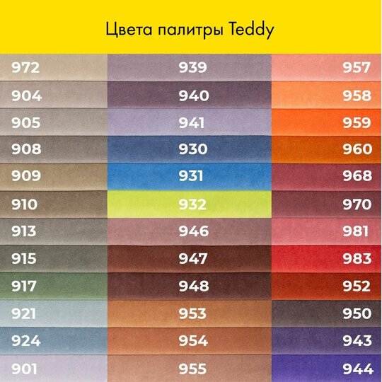 • Велюр Amigo, Onix, Ultra, Enigma, Veltto, Lovely, Fenix/Wool, Galaxy, Dream, Happy, Teddy, Glance, Brabus, Goya;
