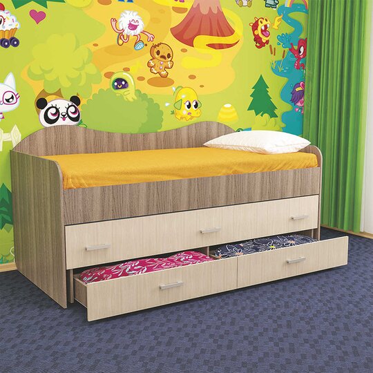 Детская кровать Нимфа – удачное приобретение для небольшой детской. Это компактная двухуровневая кровать со спальными местами 200х90 см и 190х90 см. Особенность данной модели состоит в том, что нижний ярус кровати выполнен независимым блоком. Нижняя часть кровати полностью выдвигается, а при необходимости задвигается под верхний ярус. Таким образом освобождается место для игр и занятий детей. К тому же, благодаря роликам на нижнем ящике, поверхность пола не повреждается. Также кровать оборудована двумя выдвижными ящиками, куда можно поместить постельное бельё и игрушки.