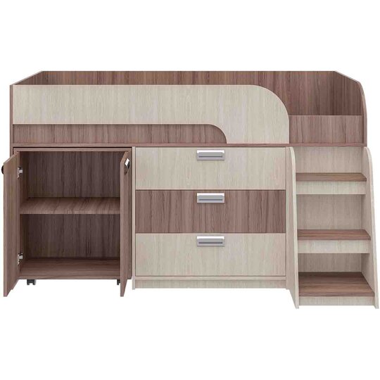 В кровати имеется выдвижной столик со шкафчиком за закрытыми дверцами. В шкафчике 2 вместительные полки для хранения одежды или игрушек. Посредине удобно расположены 3 вместительных выдвижных ящика. К кровати с лицевой стороны прилегает лесенка. Лесенка имеет 3 ступеньки и абсолютна безопасна. В боковой части кровати также имеются 3 открытые полки для хранения вещей, игрушек или чего-то особенного.