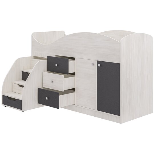 Также в комплексе Пирамидапредусмотрен шкаф со штангой и полками. Из-за небольшой высоты шкафа ребёнку будет удобно доставать и размещать в нём вещи. Ещё одно место для хранения – три выдвижных ящика в центральной части комплекса.