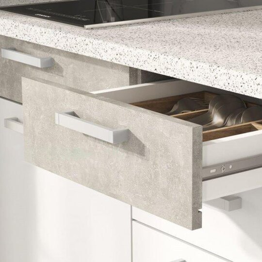 Специально разработанные модули повышают функциональность кухни, разумно организуют кухонное пространство и имеют уникальный конструктив. Корпус и часть фасадов выполнены в декоре «Ателье светлый» - это структура бетона, объединяющая в себе матовый эффект с гладким, полированным покрытием. Каменный декор прекрасно сочетается с шелковистым блеском ЛДСП «Белый шагрень», а контрастная кромка на фасадах в цвет корпуса придает кухне изысканность и актуальность.