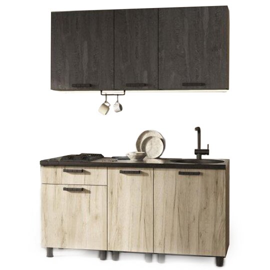 Кухня готовое решение Эдинбург 1.6 м, состоящая из двух универсальных модулей, выполнена в стиле лофт. В палитре кухни «Эдинбург» сочетается сложный древесный декор «Крафт серый» с грубым железным декором «Железный камень», за счет чего пространство обретает невероятную глубину, брутальность и первозданность.