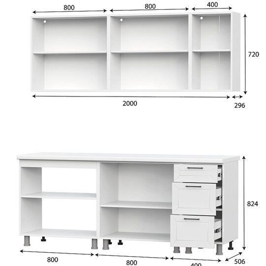 • габариты Ш*В*Г/мм/: Низ — 2000*824*506(БЕЗ СТОЛЕШНИЦЫ)/верх — 2000*720*296.