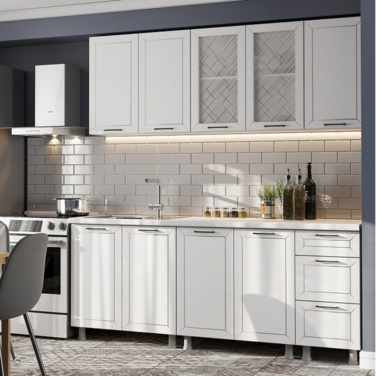 Кухонный гарнитур Вектор отличается стильными фасадами с эффектом soft touch, который придает матовость и тактильную бархатистость поверхности. Кухня с супер-матовым эффектом никого не оставит равнодушным: гладкие матовые оттенки создают впечатление окрашенных фасадов, у которых практически отсутствуют блики. Фасады кухни «Вектор» имеют дополнительный защитный слой, благодаря которому они более устойчивы к выцветанию, выгоранию и механическим повреждениям. На них практически незаметны отпечатки пальцев и следы жира, а если какие-то загрязнения все-таки появились - достаточно протереть их влажной тряпочкой или губкой.