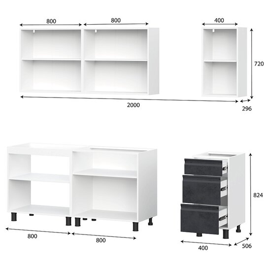 • габариты Ш*В*Г/мм/: Низ — 2000*824*506(БЕЗ СТОЛЕШНИЦЫ)/верх — 2000*720*296.