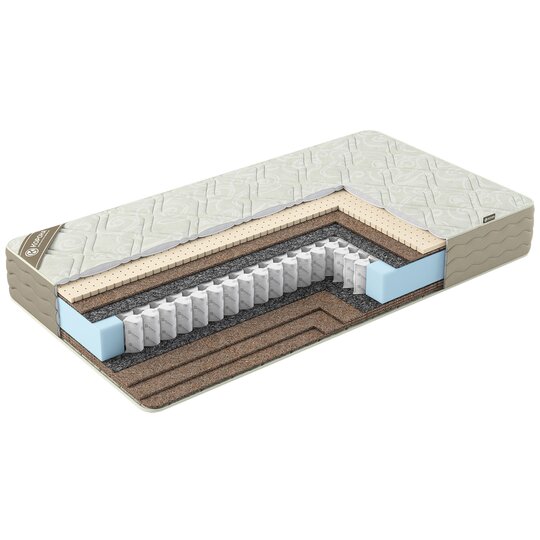 Двусторонний ортопедический матрас с кардинально разной жесткостью сторон. Комфортная сторона из натурального кокоса в сочетании с долговечным плотным латексом прекрасно держит нагрузку и не проседает со временем. Тройной слой кокосовой койры - самый жесткий тип наполнителя, который используется в линейке выпускаемой продукции. Сторона матраса, выполненная таким образом, будет выдерживать наибольший допустимый вес, сохраняя упругость.