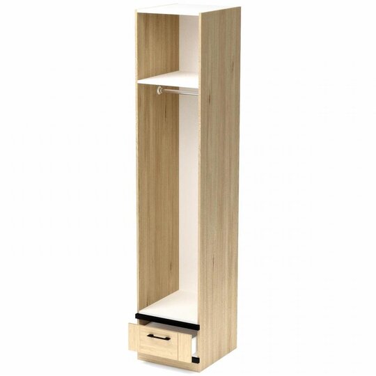 Внутри шкафа ящик, полка и штанга для вешалки. Необходимо дополнительно укомплектовать: